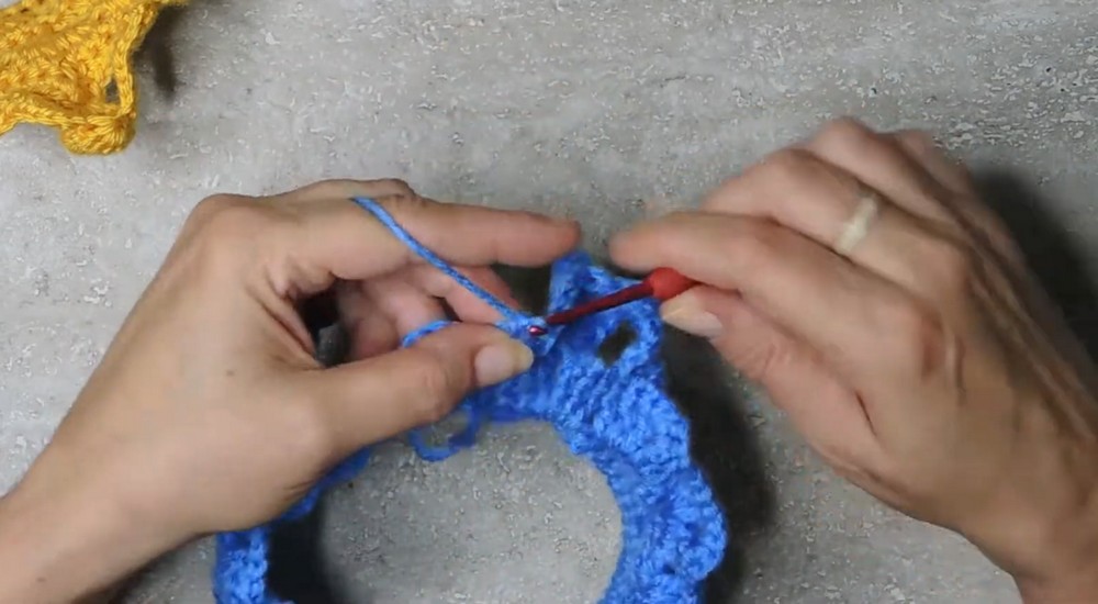 - Repeat this sequence for each chain space along the crown.