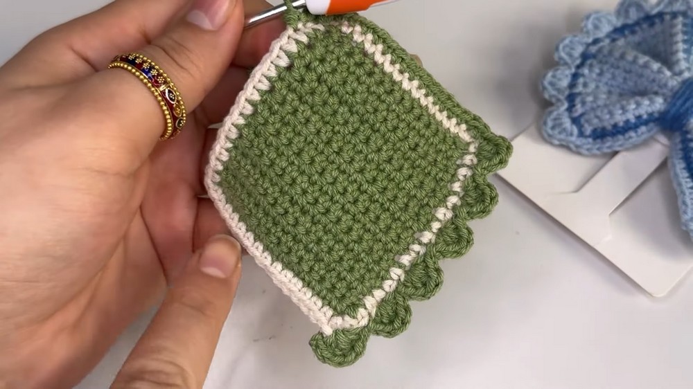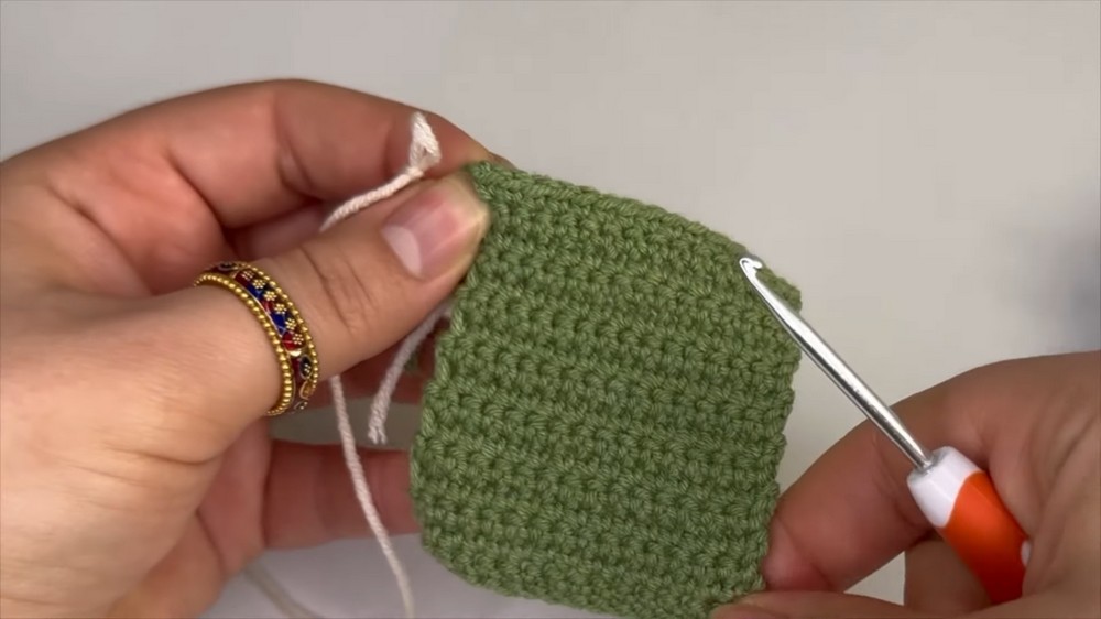 - Attach the first yarn color again (green for this tutorial). Start at a corner with a single crochet.