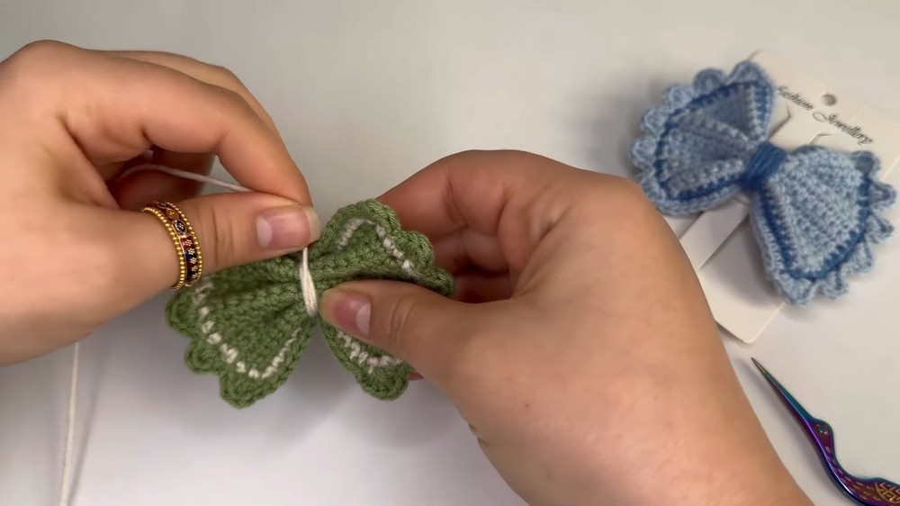 - Use a needle to fasten the wraps securely and ensure the center tie looks neat.
