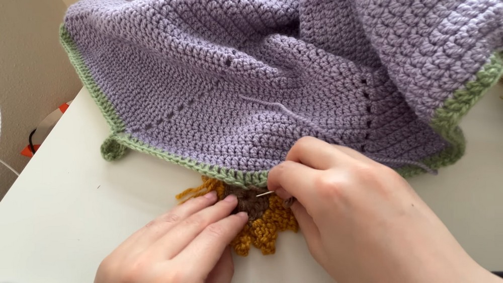 - Use a yarn needle to sew flowers onto the green section of the blanket.