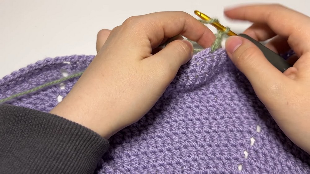 - Repeat the pattern (increase, two double crochets, chain 1) for all stitches.