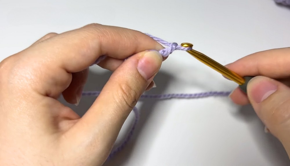 - Hold the yarn with the short strand down and the long strand looped in front.