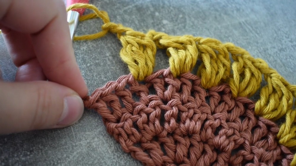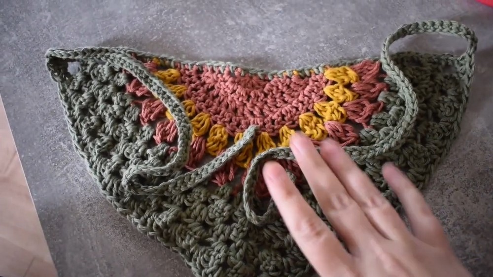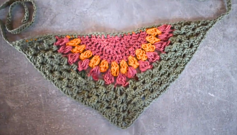 The unique construction of the bandana involves alternating two-row patterns, which gradually increase in size to create a triangular shape. The design allows for creative color changes, offering the chance to replicate the gentle hues of a sunset or experiment with entirely new combinations. Once the base is complete, straps are crocheted using extended chains, ensuring easy wearability whether tied around the neck, styled as a headscarf, or even used as a decorative accessory on bags.