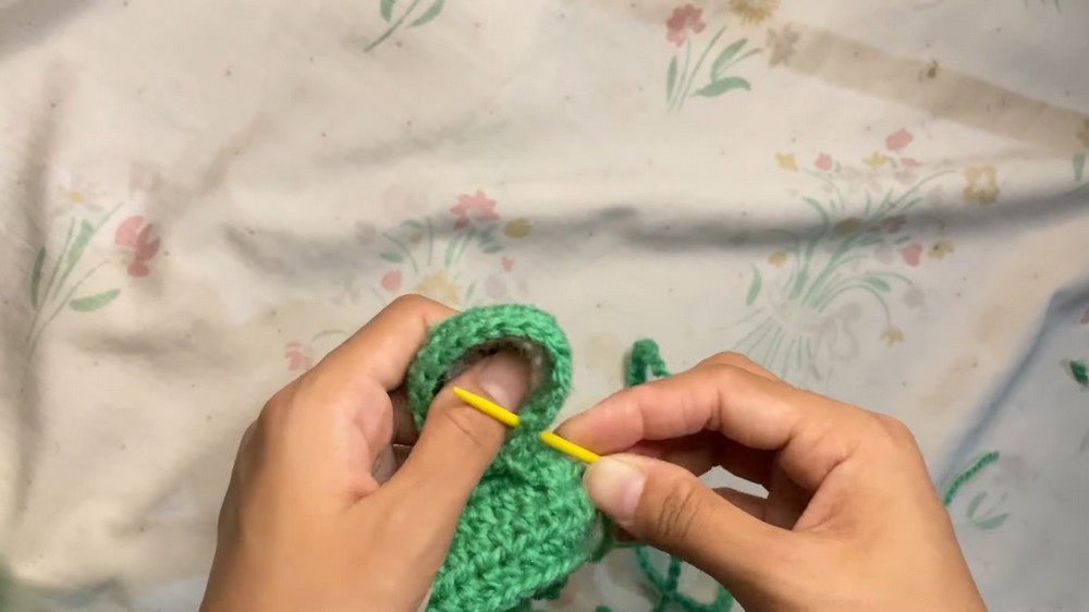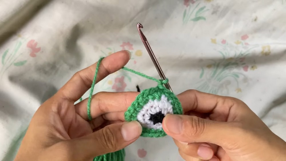 - Add green yarn and chain 1. Alternate between stitches: 1 single crochet, 1 single crochet, and 2 single crochets to reach 24 stitches.