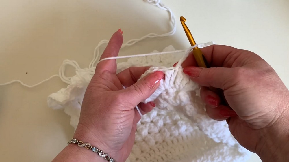 - Repeat the same for 7 rows of popcorn stitches.