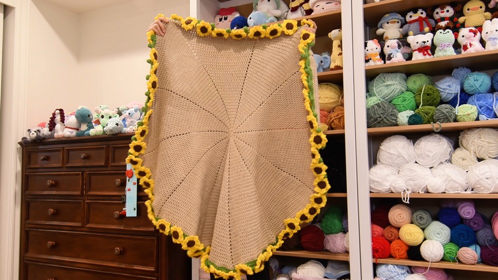 - Crochet another batch of 15 sunflowers and attach to the blanket.