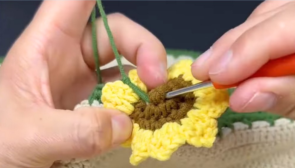 - Insert the hook into the center hole of the flower, pull the yarn through, and attach it securely with single crochets.