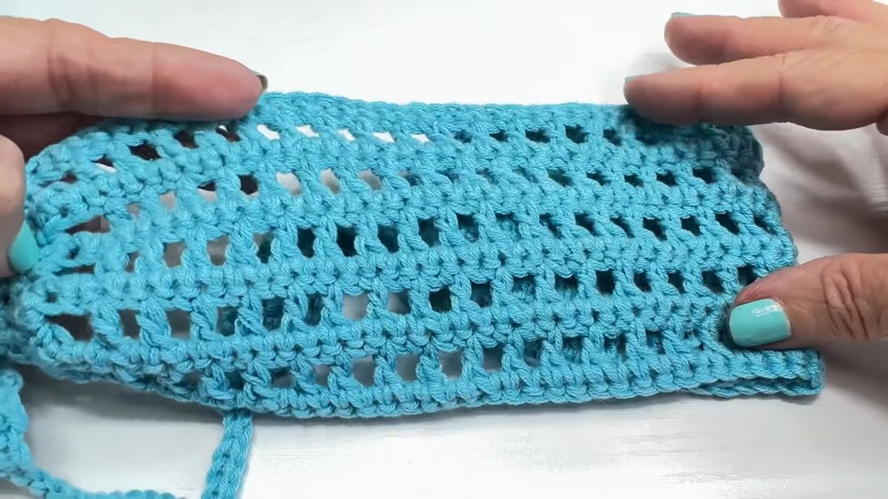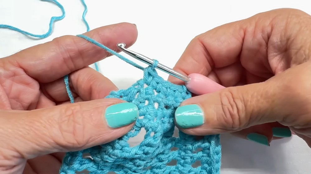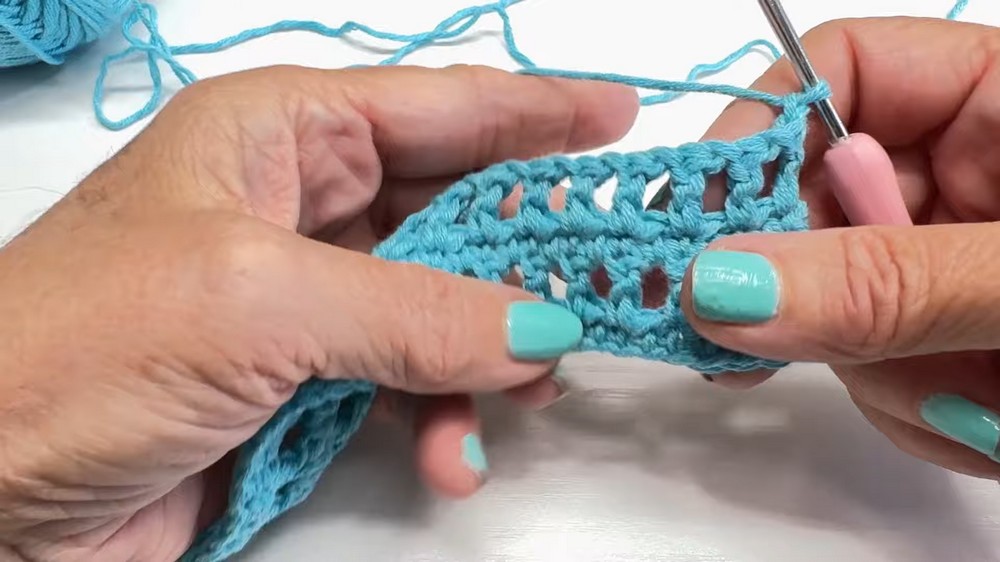 - You will observe five sets of chain spaces forming a lacy pattern.