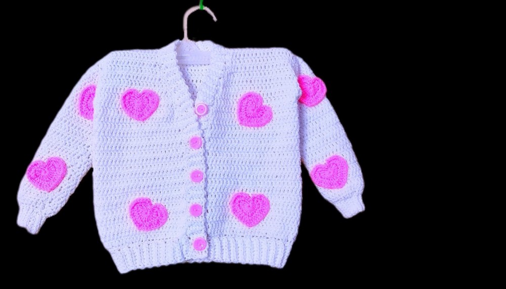 This crochet cardigan is a delightful project that allows beginners and intermediate crocheters to practice essential techniques like double crochet, ribbed stitching, and seamless assembly. With its thoughtful design, practical ribbing, adorable decorative hearts, and cozy texture, this cardigan is as functional as it is beautiful.